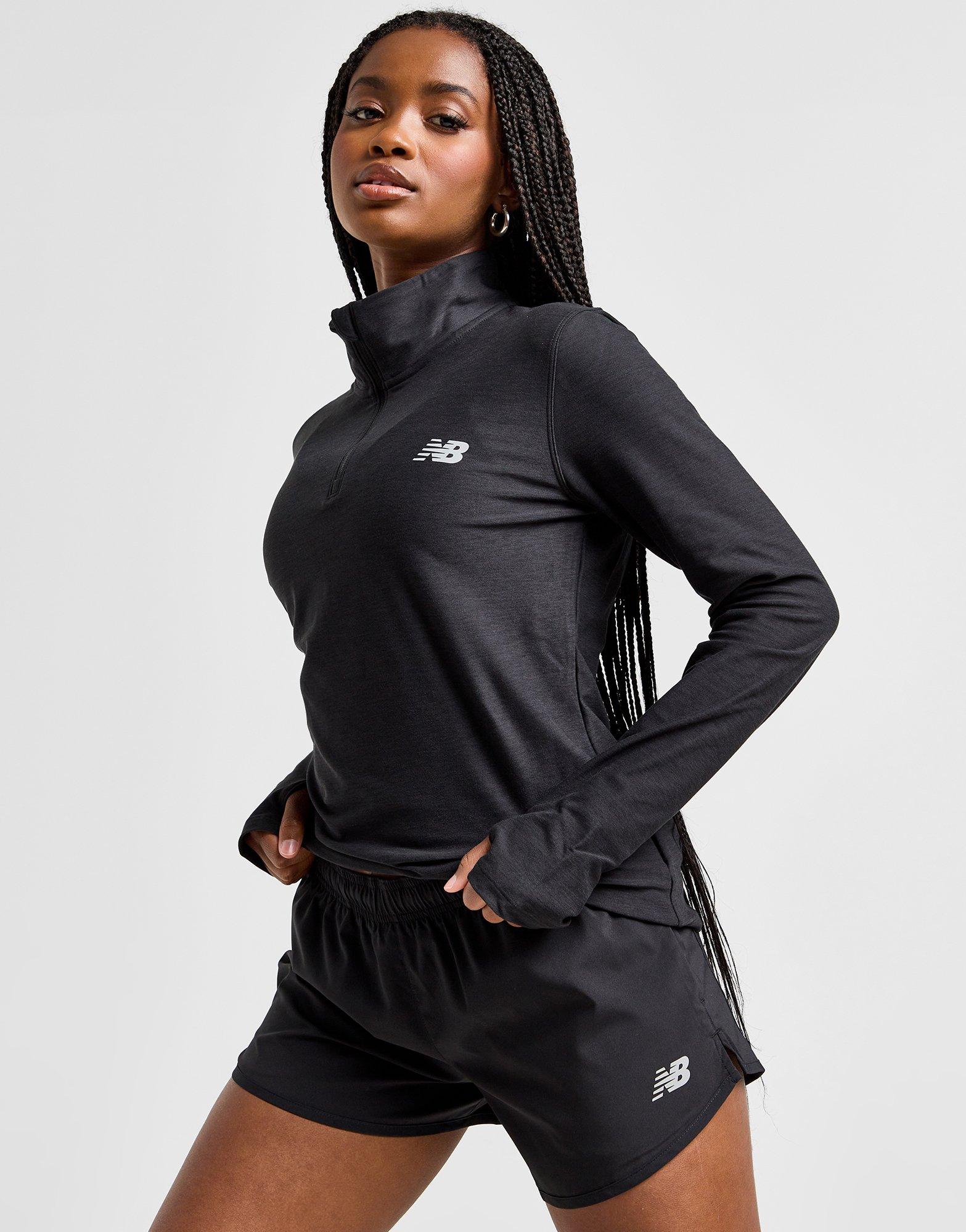 Train in a fresh layer with this women's Logo 1/4 Zip Top from New Balance. In a Black colourway, this lightweight fitness top is made from stretchy recycled polyester knit fabric, with sweat-wicking NB DRY tech added in for cool comfort. The long sleeves have thumbholes on the cuffs for extra coverage, while the quarter zip fastening and stand-up collar creat airflow when the session heats up. Finished off with a reflective NB badge printed on the chest. Machine washable. | Our model is 5'7" and wears a size small.