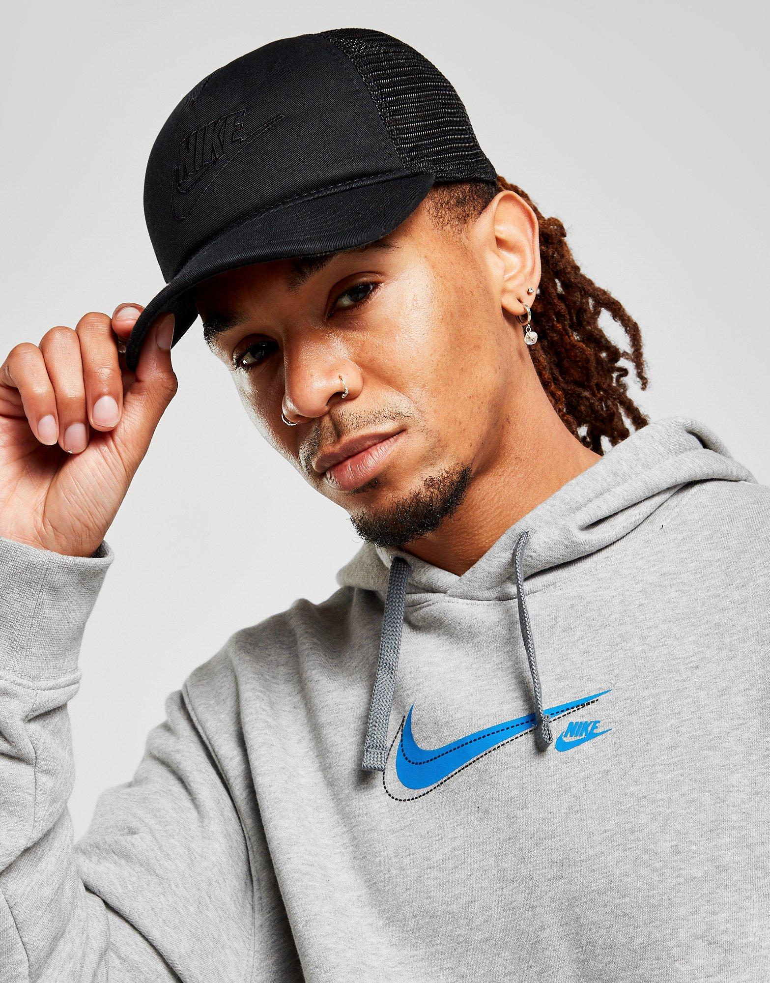 Step up your look with this Futura Trucker Cap from Nike. In a Black colourway, this cap is made from durable, woven twill fabric with sheer mesh to the back for a classic look. It features a curved peak and an adjustable strapback fastening for a custom fit. Finished with tonal Nike Futura branding embroidered to the crown. Hand wash.