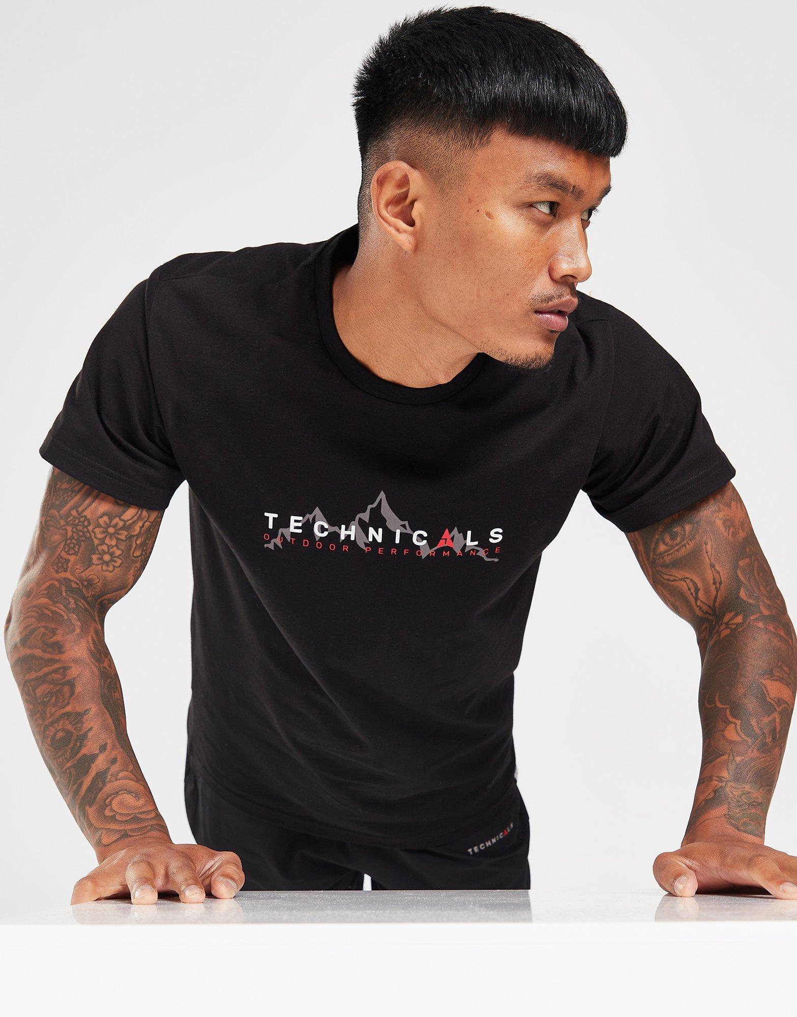 Update your staples with this men's Crag T-Shirt from Technicals. In a Black colourway, this standard fit tee is cut from light, stretchy cotton fabric for everyday comfort. It features short sleeves with a ribbed crew neckline and is finished up with Technicals branding and a graphic to the chest. Machine washable | Our model is 6'0" with a 40" chest and wears a size medium.