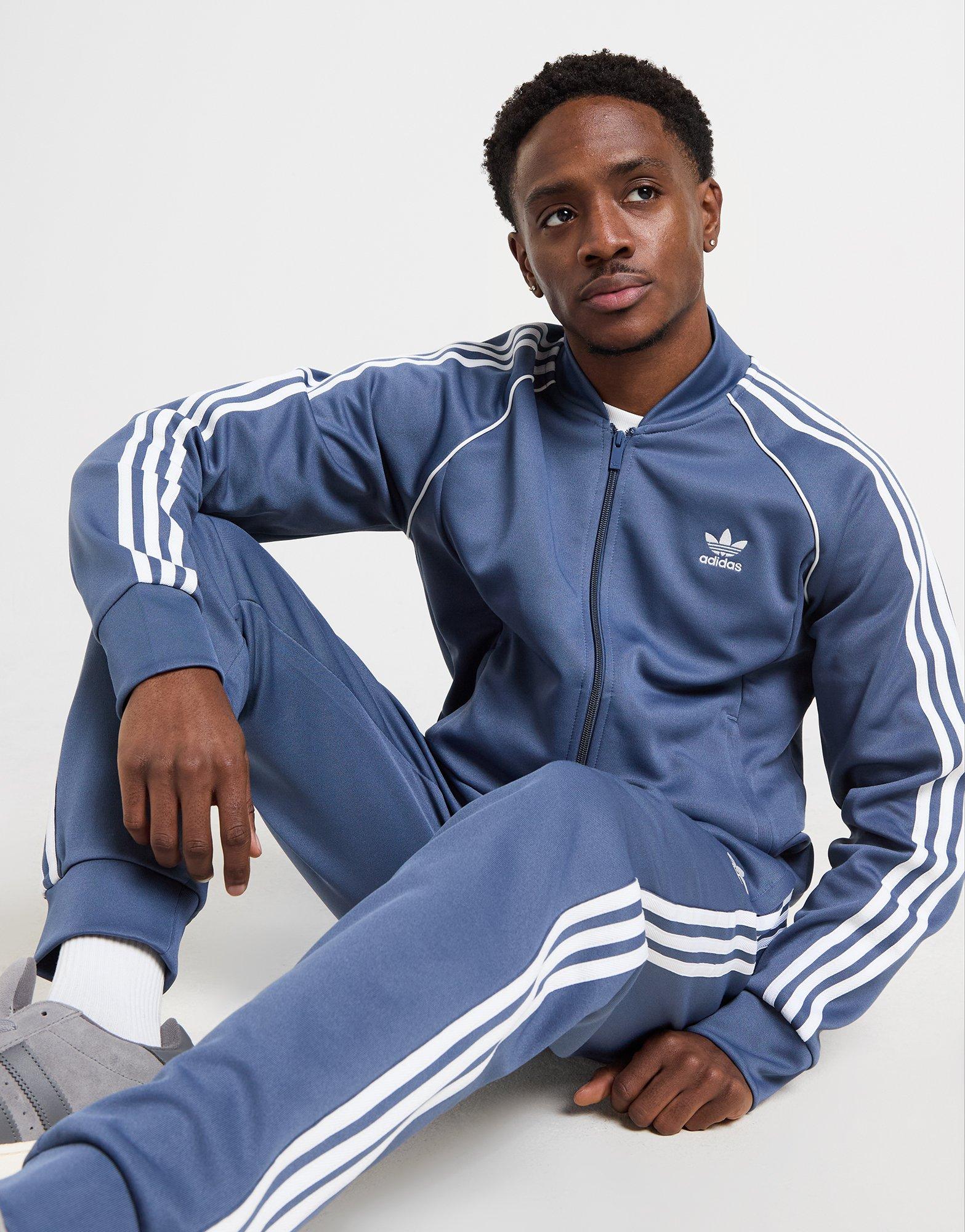 Zip up in a JD-exclusive edition of 3-Stripes heritage with this men's SST Track Top from addias Originals. Landing in a Preloved Ink colourway, this slim-fit top is made from a smooth knit blend of recycled polyester and cotton. It features a full zip fastening to the front, a classic bomber collar and stretchy ribbed sleeves. With sporty piping and raglan sleeves, it's finished zippered pockets and the Trefoil crest. Machine washable. | Our model is 5'11" with a 38" chest and wears a size M. | KB0489