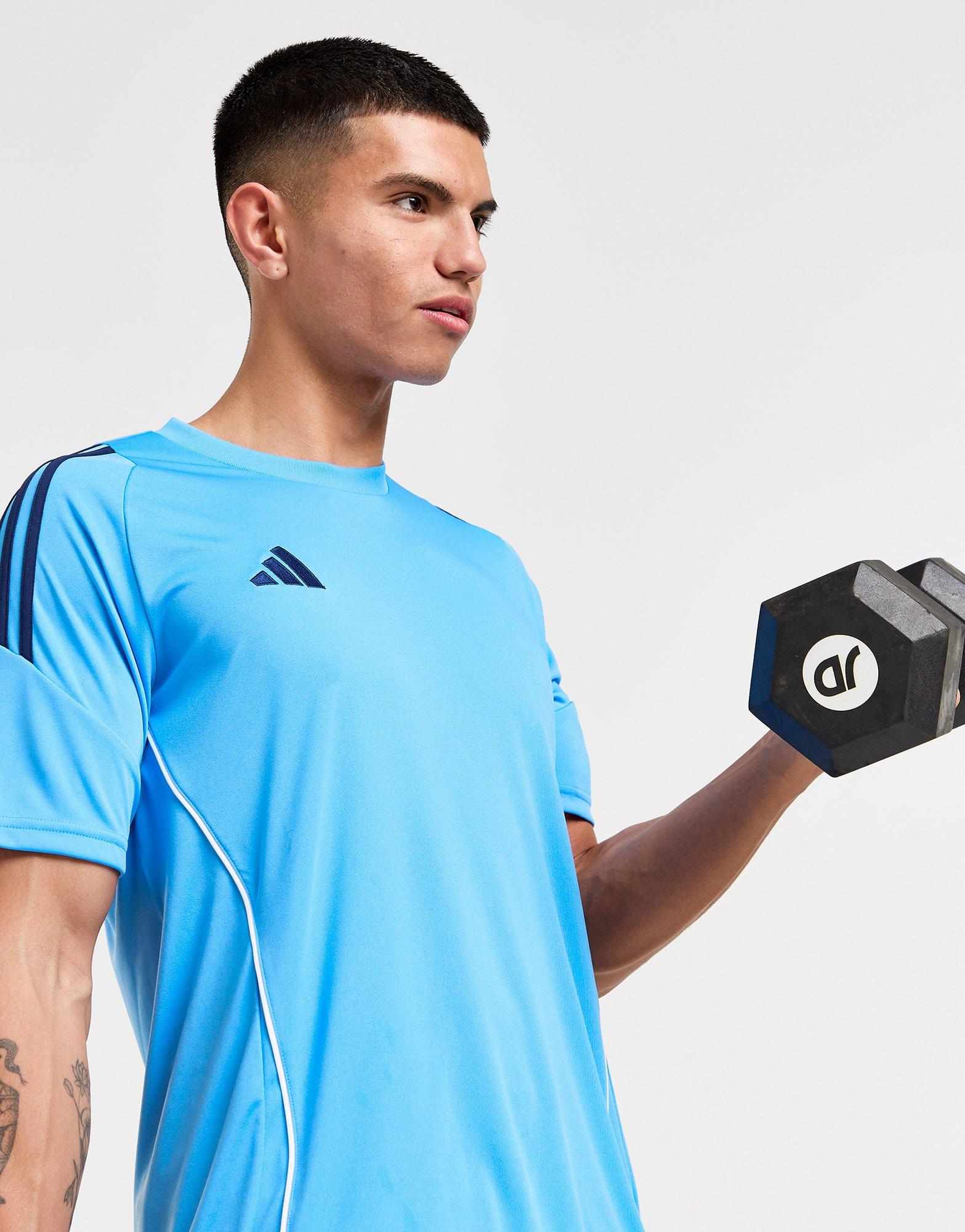 Get the staples right when you train in this men's Tiro 24 T-Shirt from adidas. In a Blue Burst colourway, this athletic-fit tee has a crew neckline and short sleeves with Team Navy Blue 3-Stripes down the sides. It's built from smooth recycled polyester fabric, with AEROREADY tech delivering cool, sweat-wicking comfort. Finished off with the Performance logo printed on the chest. Machine washable. | Our model is 6'0" with a 36" chest and wears a size medium. | JJ2548