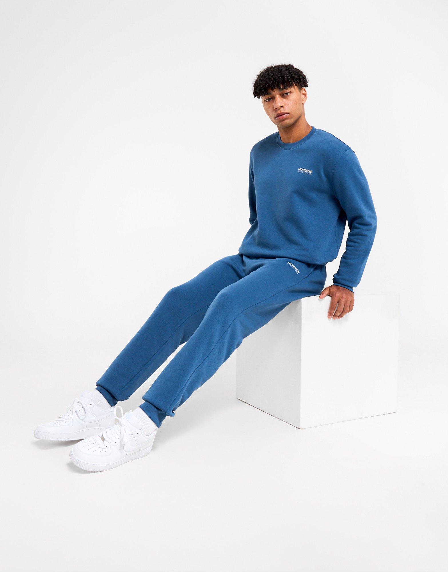 Add some street-ready style to your rotation with this men's Essential Crew Tracksuit from McKenzie. In a Blue colourway, this JD-exclusive tracksuit is made with a soft, durable cotton and recycled polyester blended fabric fort lasting comfort. The sweatshirt has a crew neckline and long sleeves for a classic look, with ribbed trims to hold the shape. The matching joggers feature an elastic waistband and cuffed ankles to keep you locked in, with side pockets for storage. Finished up with signature McKenzie branding on the chest and thigh. Machine washable. | Our model is 6'0" with a 39" chest and wears a size M.