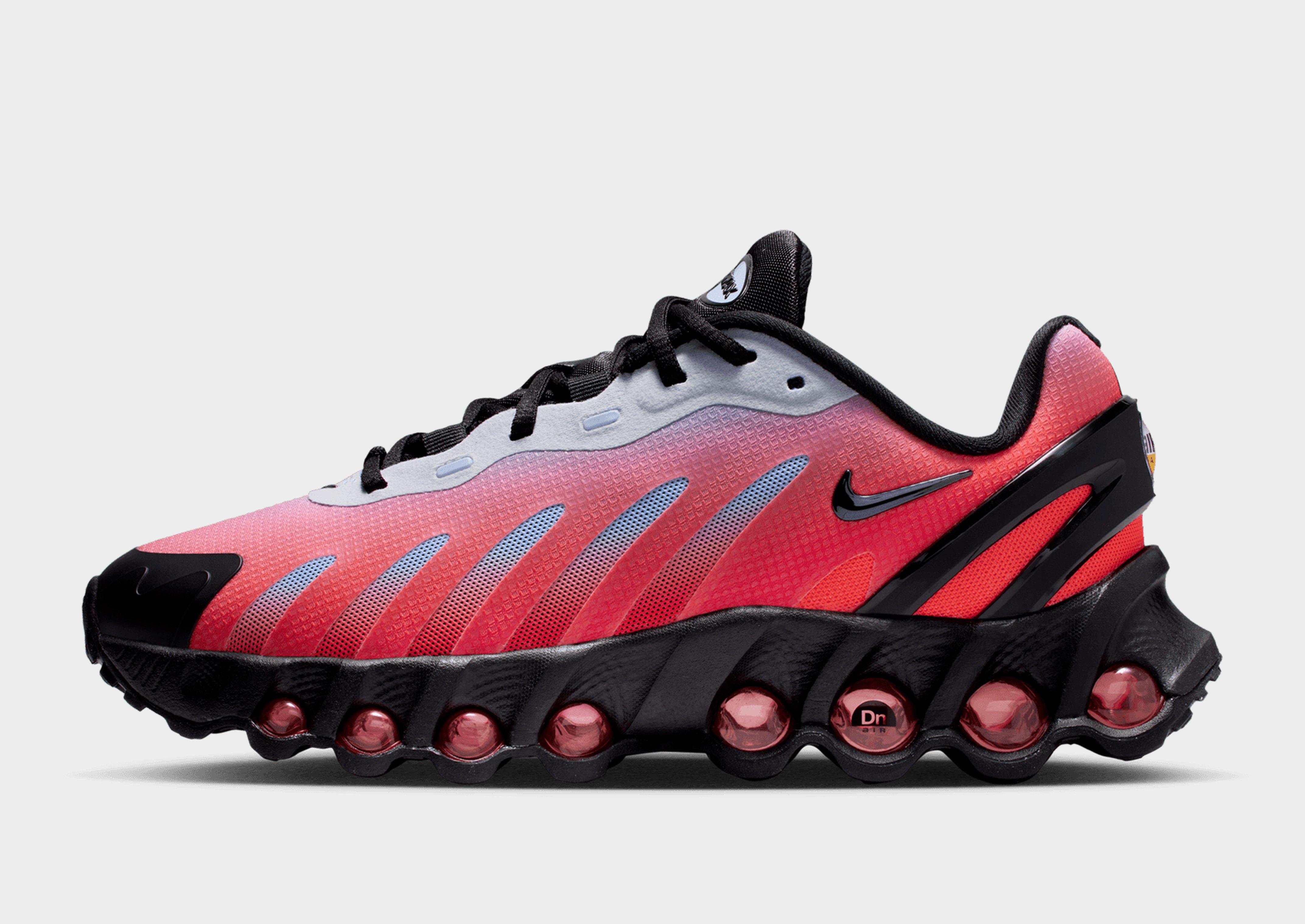 A new era of Nike is here. These juniors' Air Max Dn8 trainers land in Royal Tint, Black and Bright Crimson. They've got a sculpted mesh upper with slashes at the sides to keep things cool. The plastic heel clip locks you in, while flex grooves let you move freely. And comfort? Wow. The Dynamic Air system uses dual-chambered tubes with tuned pressure levels for a soft, bouncy stride. Sat above a grippy rubber outsole, they're signed off with signature Nike Air Max branding.