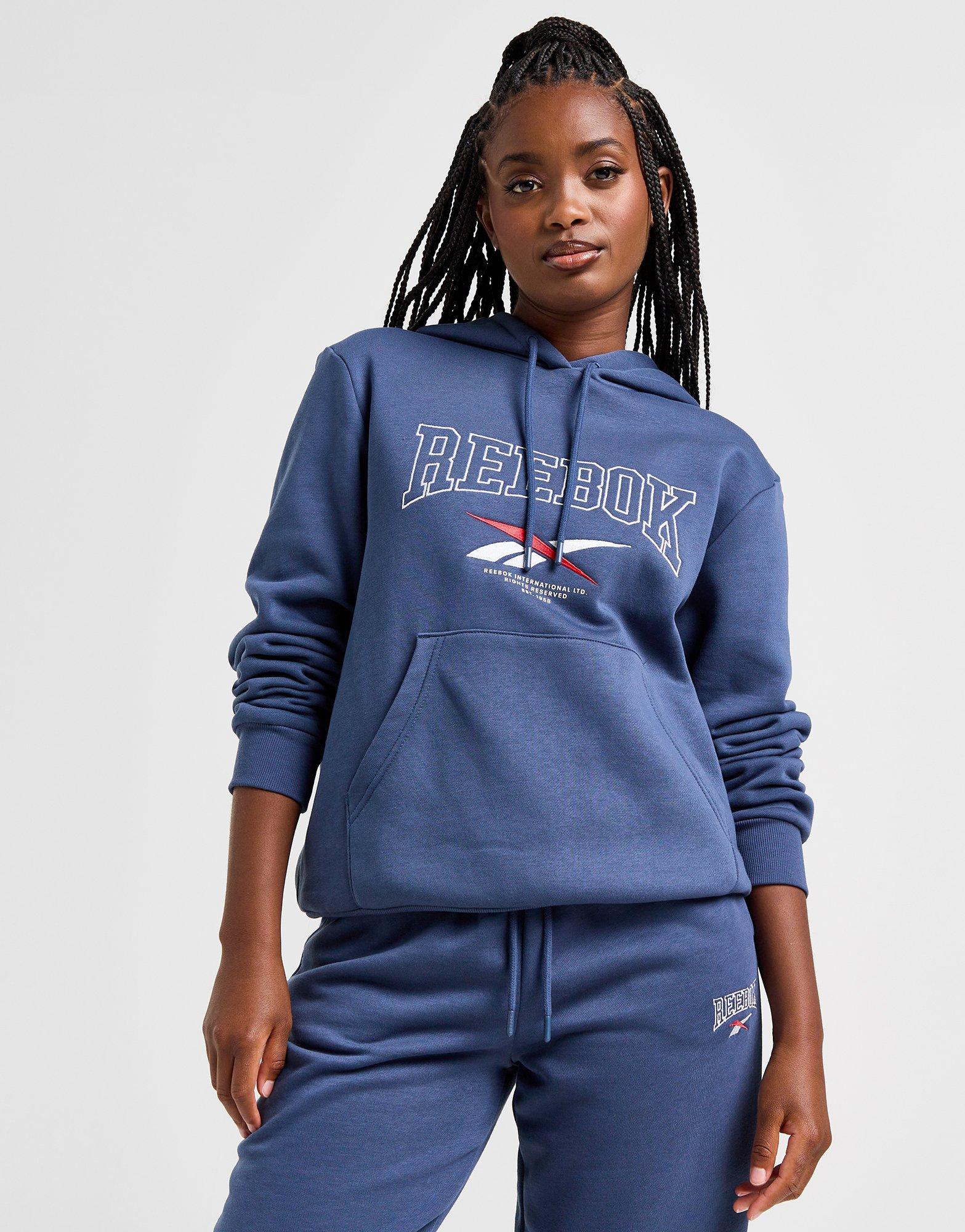 Update your layer game with this women's Bowkers Overhead Hoodie from Reebok. In a Navy colourway, this standard fit hoodie is cut from soft fleece fabric for everyday comfort. It features an adjustable pullover hood for custom coverage, with ribbed trims to hold the shape and a kangaroo pouch for easy storage. Finished up with classic Reebok branding to the chest. Machine washable | Our model is 5'7" and wears a size small.