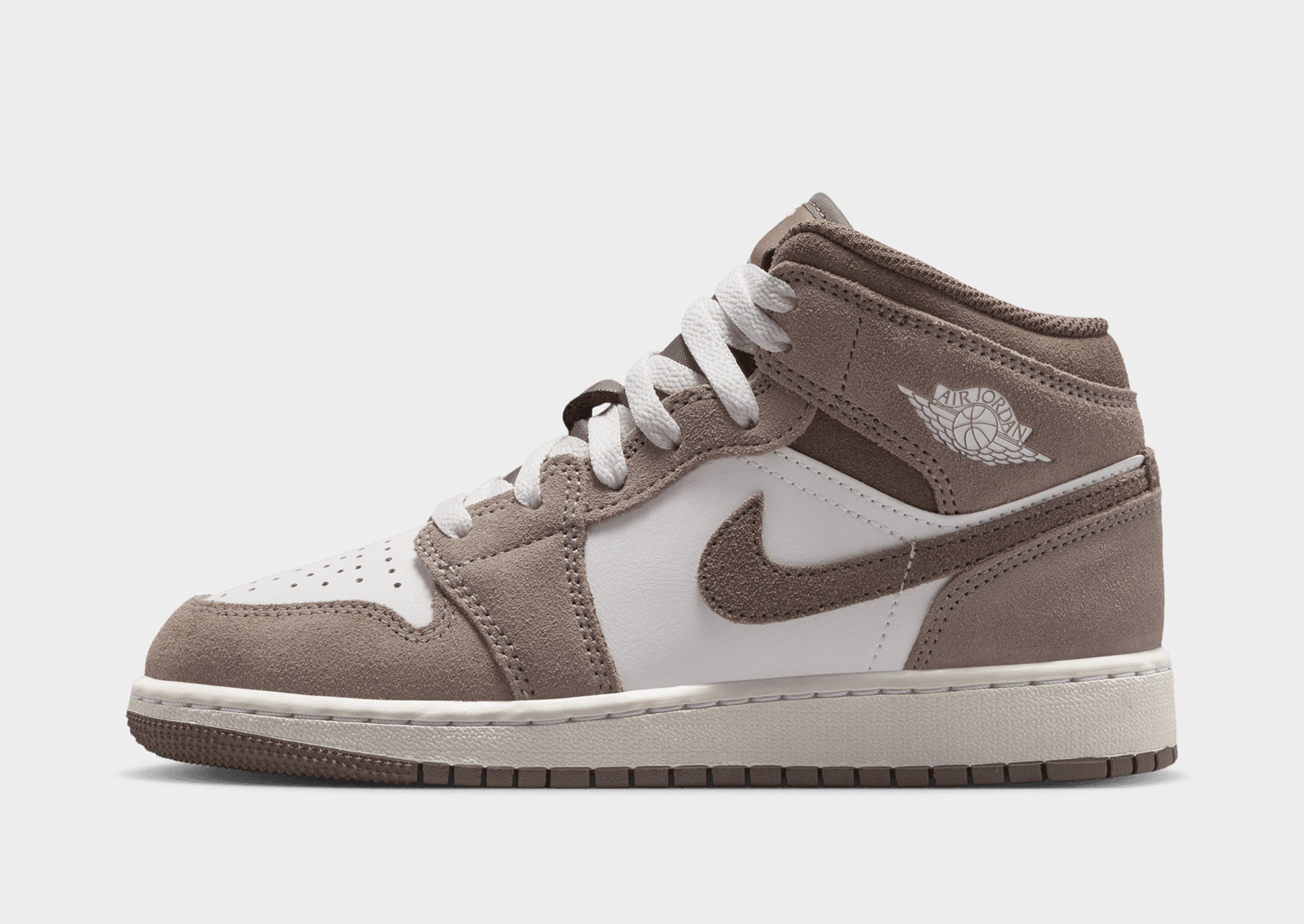 The junior Air Jordan 1 Mid in Taupe Grey with White is the understated, neutral colourway on one of basketball's most iconic silhouettes - and a great entry point for younger sneaker fans. Built from leather and synthetic materials with a padded collar and tongue for all-day comfort, the mid-top construction delivers the iconic AJ1 profile alongside Nike Air cushioning in the heel for lightweight, responsive cushioning. The Taupe Grey with White colourway is clean and versatile, pairing back to almost any outfit without effort. A rubber outsole with pivot circle wraps up a junior Jordan court-to-street trainer built to last. Style Code: DQ8423-003