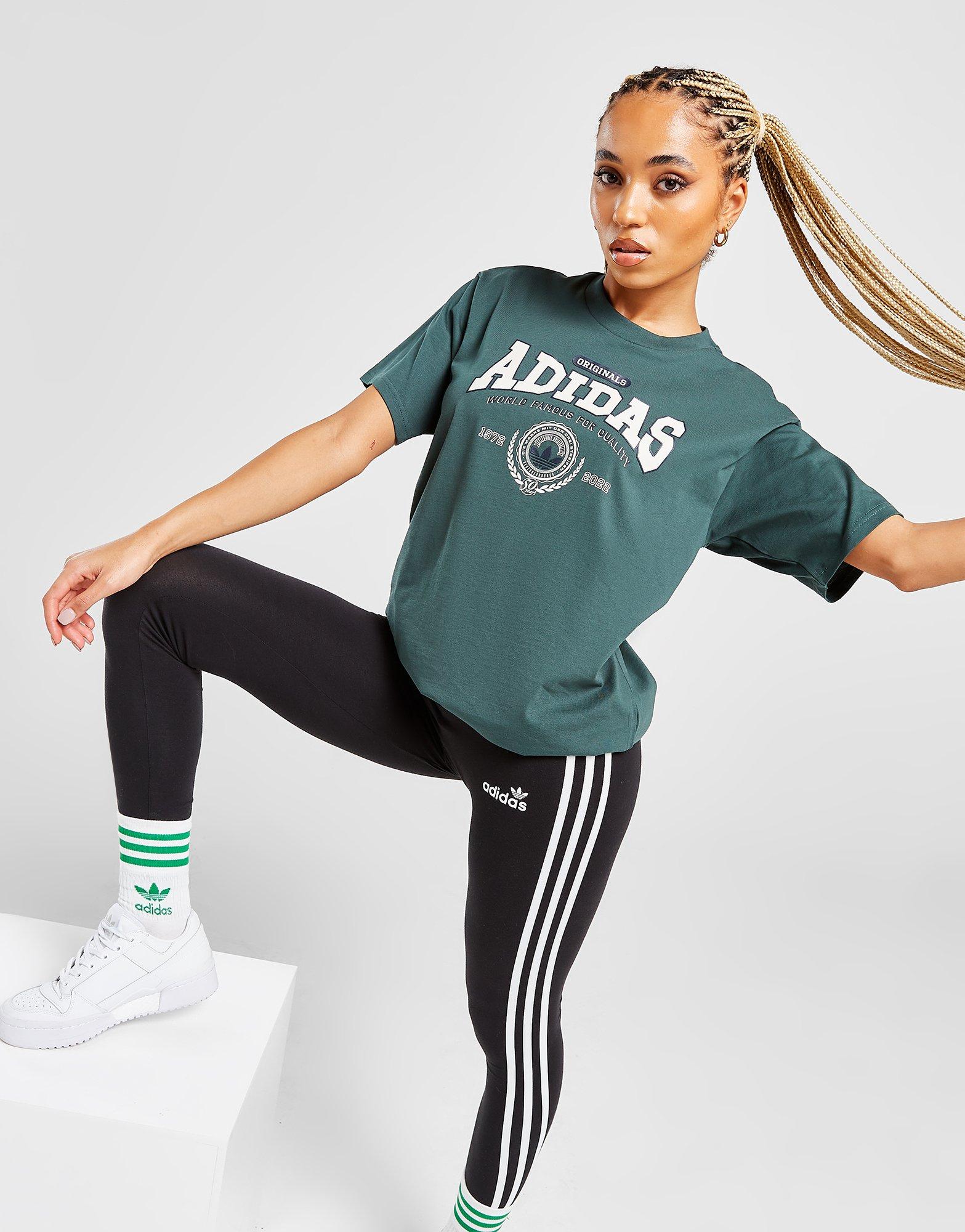 Freshen your rotation with a retro style in this women's Varsity Logo T-Shirt from adidas Originals. Coming in a Mineral Green colourway, this loose-fit tee is cut from a cotton fabric that's super-soft and lightweight for laidback wear. It features a ribbed crew neckline with dropped shoulders and short sleeves for a relaxed vibe. Signed off with adidas Originals branding to the chest. Machine washable. | Our model is 5'8" and wears a size small.|IA8328