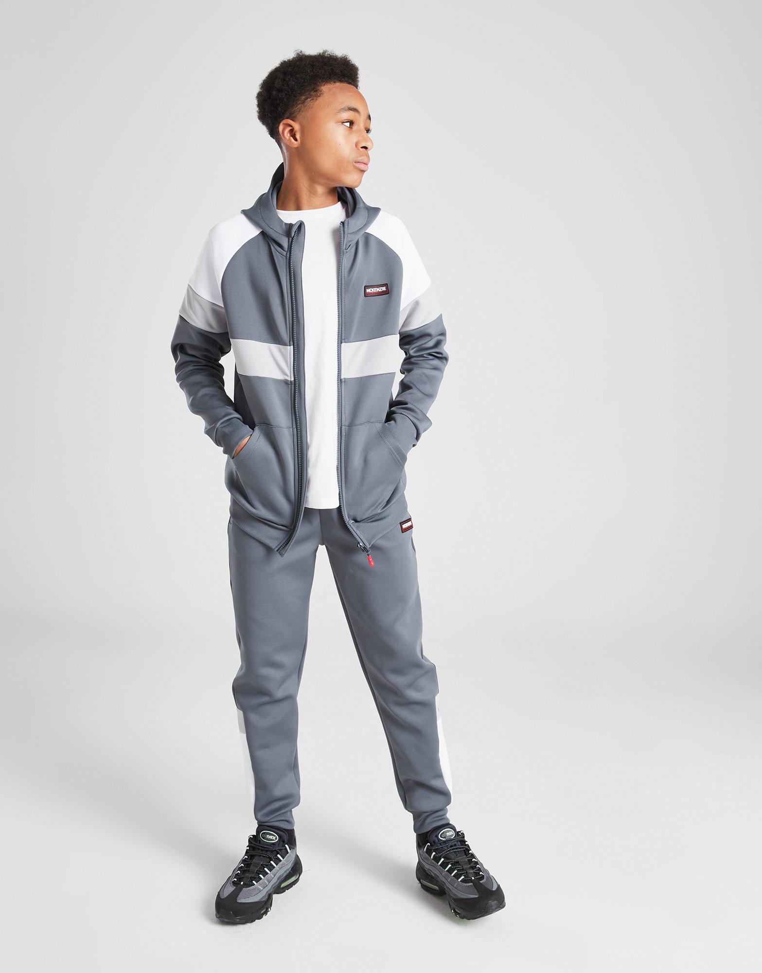 Exclusive to JD. Cop a casual 'fit with these juniors' Nova Poly Track Pants from McKenzie. Landing in a Grey colourway with White panels, they're cut from a smooth polyester knit fabric for all day comfort. They feature a drawcord-adjustable waistband and cuffed ankles for a secure fit, with open side pockets to stash away your stuff. To finish up, they're signed off with a McKenzie logo badge on the left leg. Machine washable. _