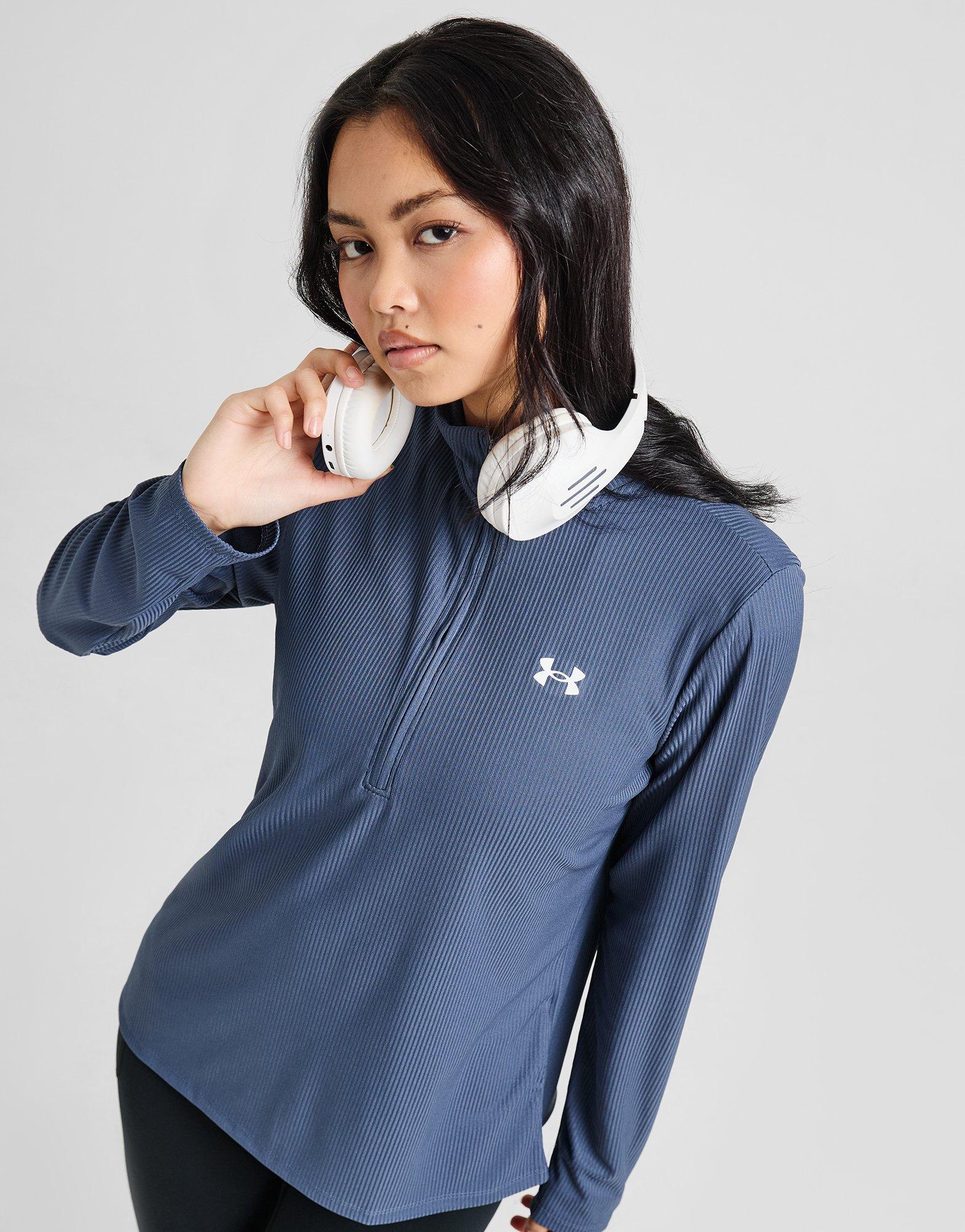 Upgrade your workoutwear with this women's Tech Ribbed 1/4 Zip Top from Under Armour. In a Downpour Grey colourway, this standard fit top is cut from breathable UA Tech that wicks away sweat. It features a 1/4-zip fastening for custom coverage and is finished up with classic Under Armour branding. Finished up with signature Under Armour branding. Machine washable. | Our model wears a size S.