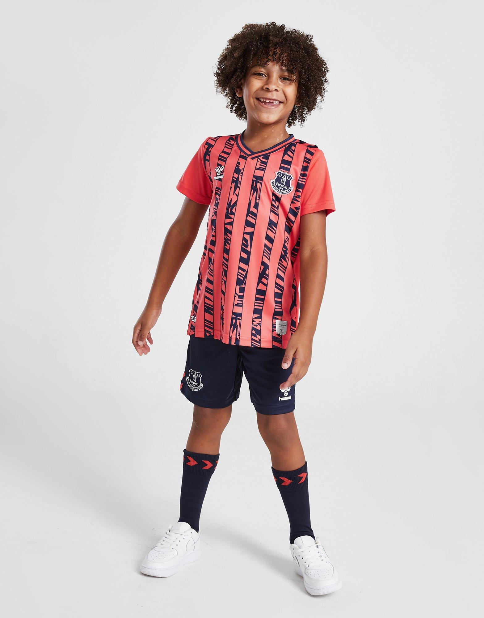 Get them match-ready in their fave team's strip with this children's Everton FC 2023/24 Away Kit from Hummel. Inspired by the '90s, this downsized set is made from smooth and breathable polyester fabric, with the shirt built from ECO8 tech using recycled plastic bottles. It comes in a Coral and Navy colourway, and features graphic stripes to the V-neck top, while the shorts have an elasticated waistband. With knee-length socks to complete the kit, it's finished off with signature Hummel branding and the Everton crest. Machine washable.