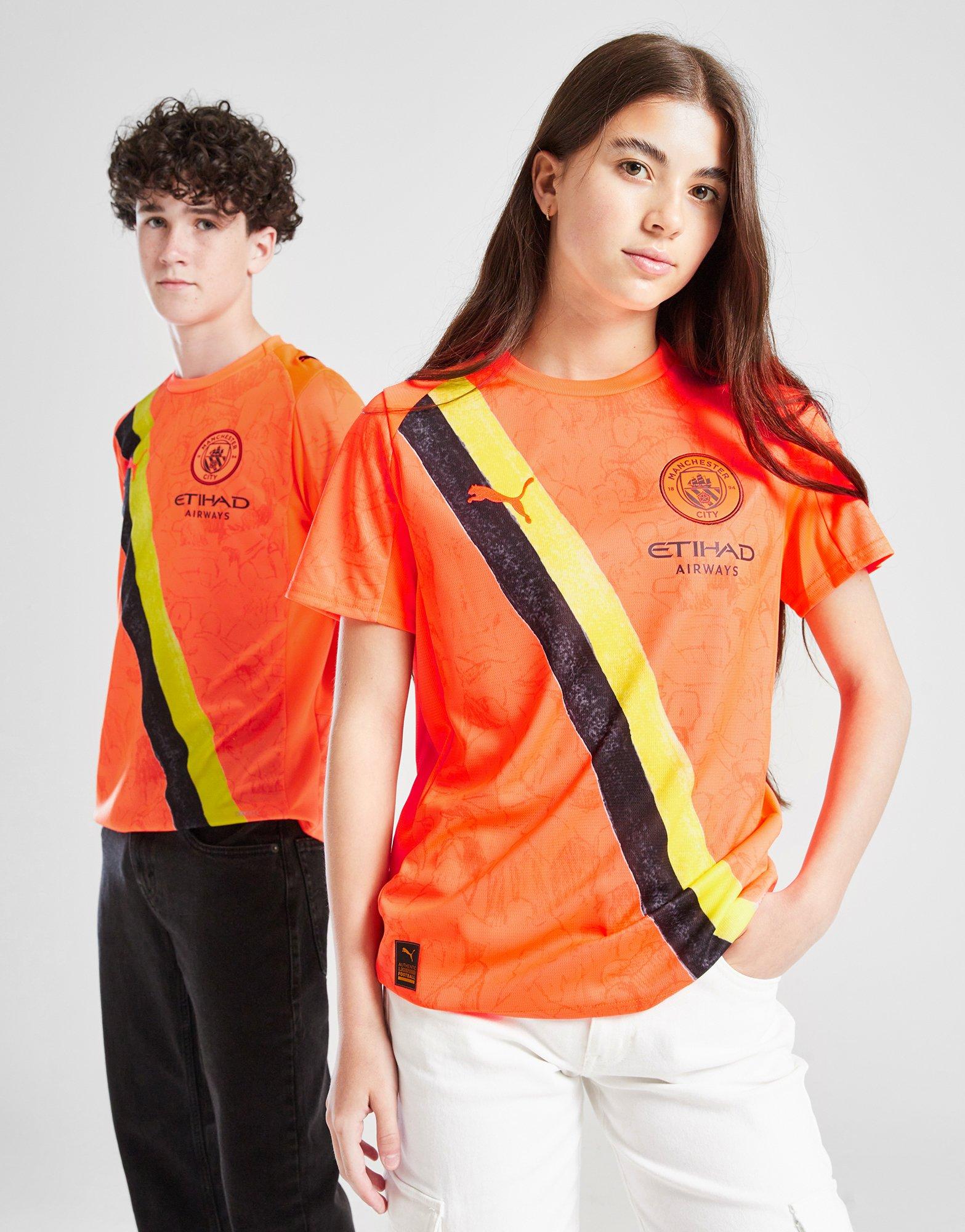 Rep your team on the big stage with this juniors' Manchester City FC 2025 Club World Cup Away Shirt from PUMA. In a Neon Sun colourway, this shirt is made from lightweight, breathable recycled polyester for total comfort. It has a crew neckline and short sleeves for a classic cut, while dryCELL sweat-wicking tech keeps things dry. With diagonal sash stripes to the don't, it's signed off with the PUMA Cat logo and Manchester City crest to the chest. Machine washable.