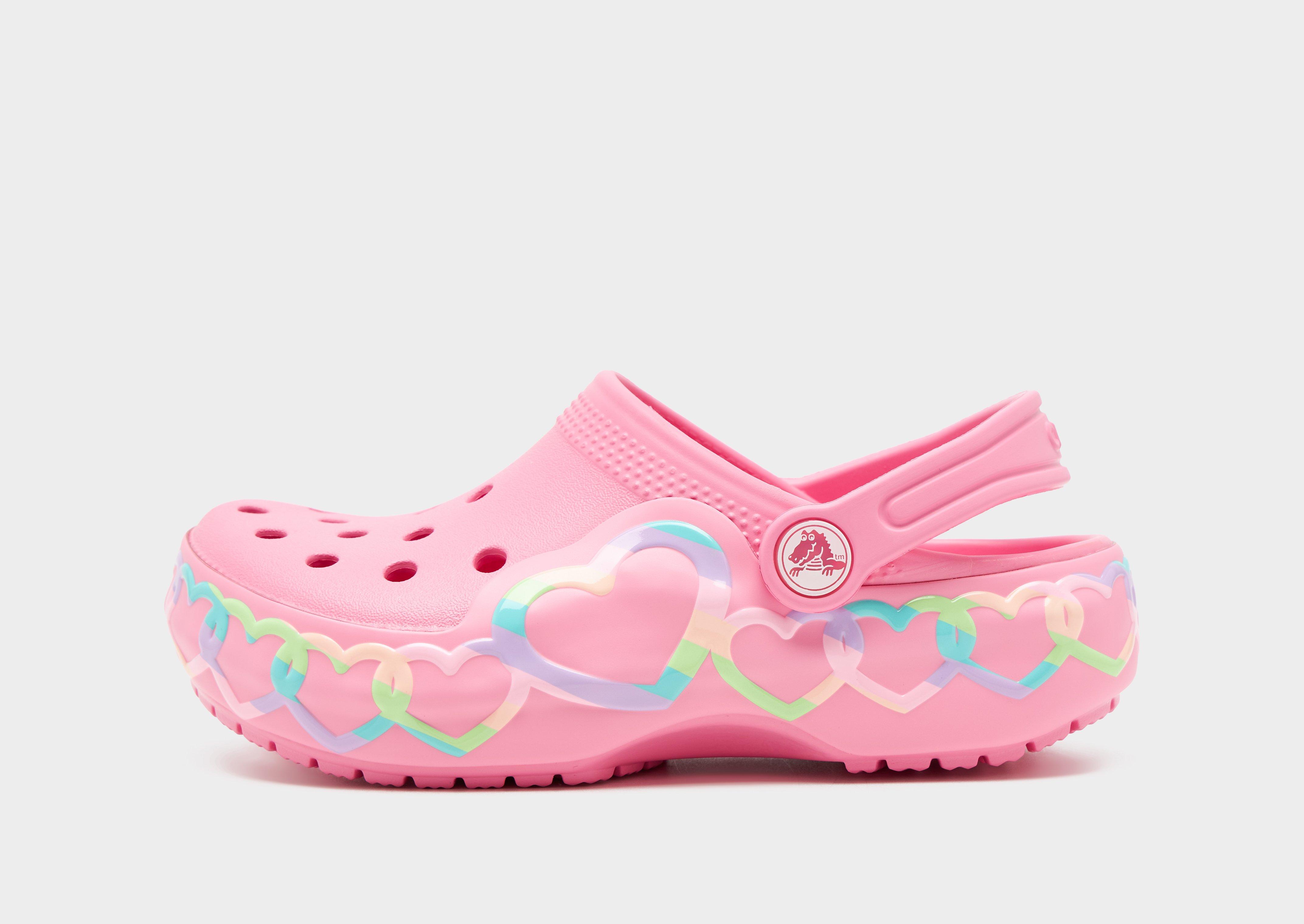 Pretty and practical, the kids' Crocs Classic Clog in Pink with Heart graphics is a go-to sandal for little ones who love a bit of personality in their footwear. Made from Crocs' signature Croslite foam, it is lightweight, waterproof, and flexible, making it the easy choice for school, the beach, or everywhere in between. The pink colourway with heart detailing brings an instantly loveable aesthetic that is hard to say no to, while a pivoting heel strap keeps little feet secure on the go. Ventilation ports and Jibbitz charm compatibility make this kids' Crocs clog as fun as it is functional. Style Code: 213183-669
