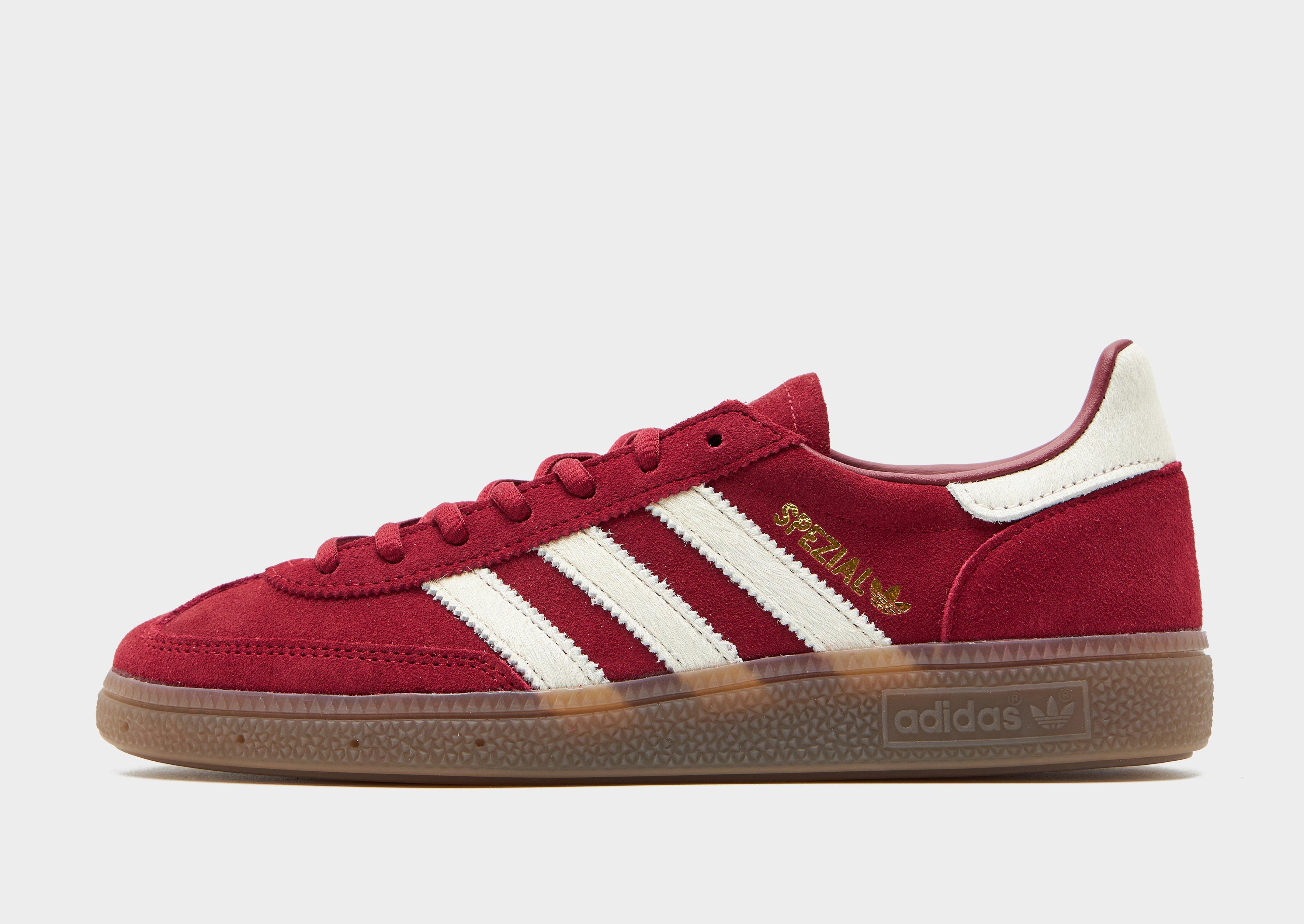 From the terrace to the street, rep a classic look with these women's Handball Spezial shoes from adidas Originals. First introduced in 1979 for the speedy handball courts of Germany, the simple yet stylish silhouette quickly made it a go-to, iconic trainer. Landing in a Maroon colourway with Cream details, these JD-exclusive sneakers have an upper made with pony-hair, suede and nylon for durable wear. They feature a lace fastening with a padded ankle collar for a locked-in fit and sit on a lightweight midsole. With a gum rubber outsole for total traction, they're signed off with signature Adi 3-Stripes to the sidewalls. Style Code: KI2498