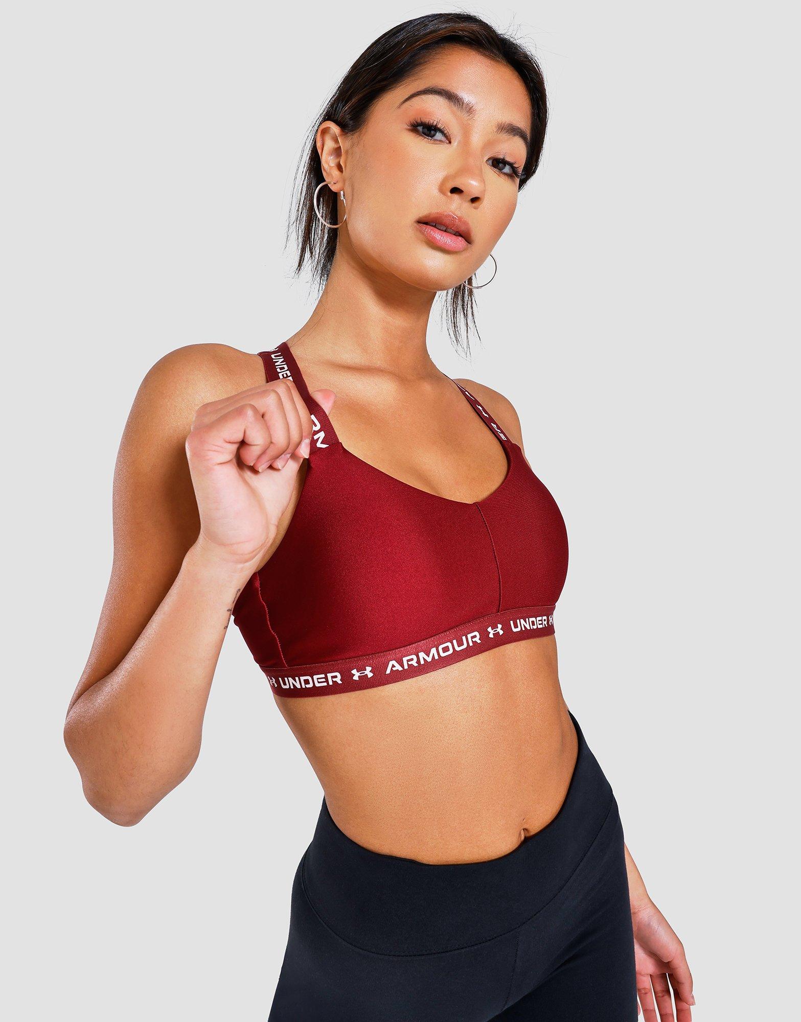 Workout in ultimate comfort with this women's Cross Back Bra from Under Armour. In a red colourway, this second skin fit sports bra delivers strategic support, ideal for medium-impact activities like cycling, weight training and boxing. Made from a stretchy fabric, it's equipped with HeatGear tech and wicks sweat from the skin. Soft, breathable cups provide extra structure and coverage, while crossover straps bring a supportive feel. Finished up with Under Armour branding to the under bust band. Machine washable. | Our model is 5'8" and wears a size small.