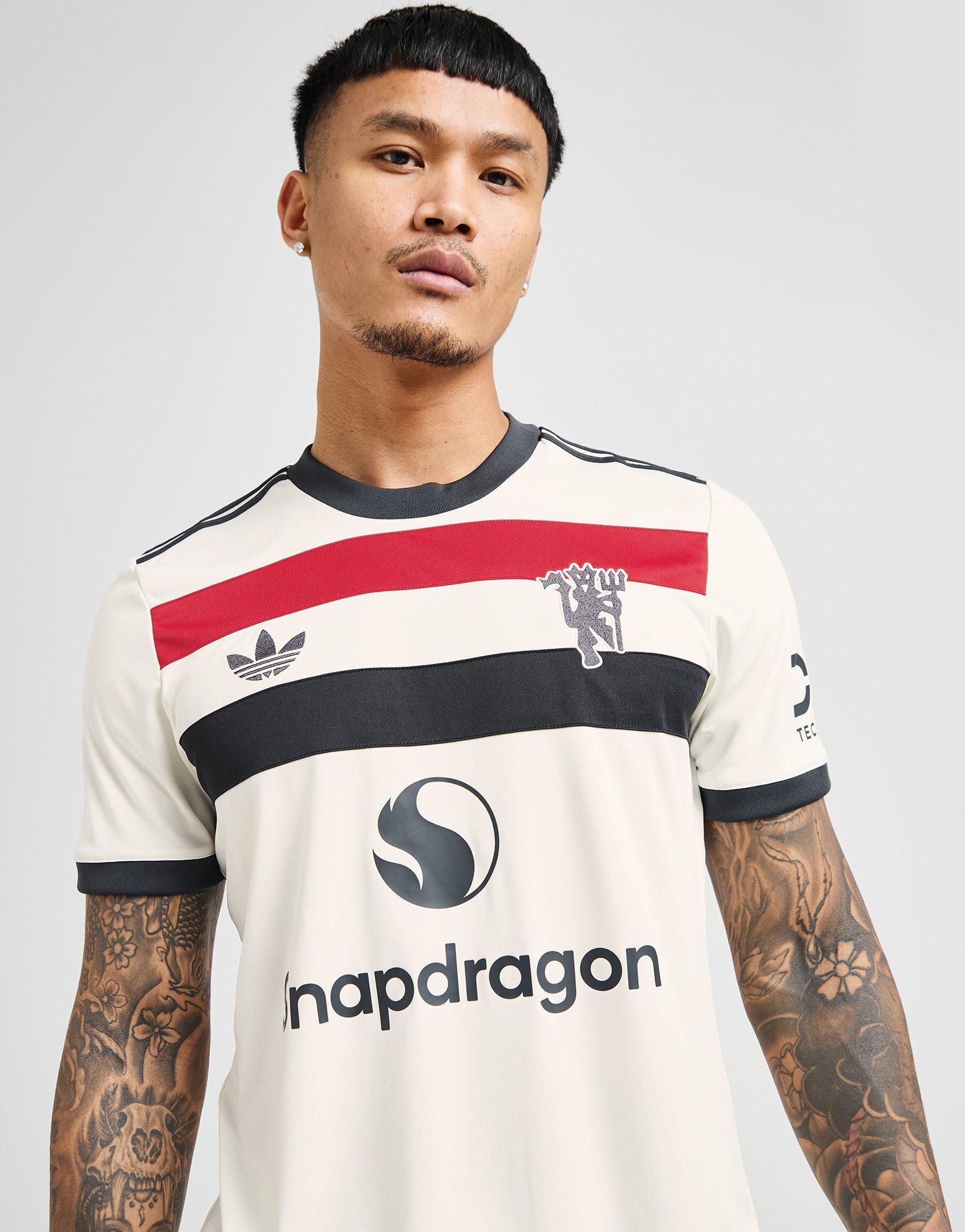 Show your team pride when on the road with this men's Manchester United FC 2024/25 Third Shirt from adidas Originals. In an Off White colourway with a Red and Black stripe to form the club's flag, this slim fit shirt is cut from light, breathable recycled polyester for cool comfort. It features short sleeves with a ribbed crew neckline and is equipped with AEROREADY tech to wick away sweat. Finished up with the Trefoil logo and Manchester United crest to the chest. Machine washable | IY7806