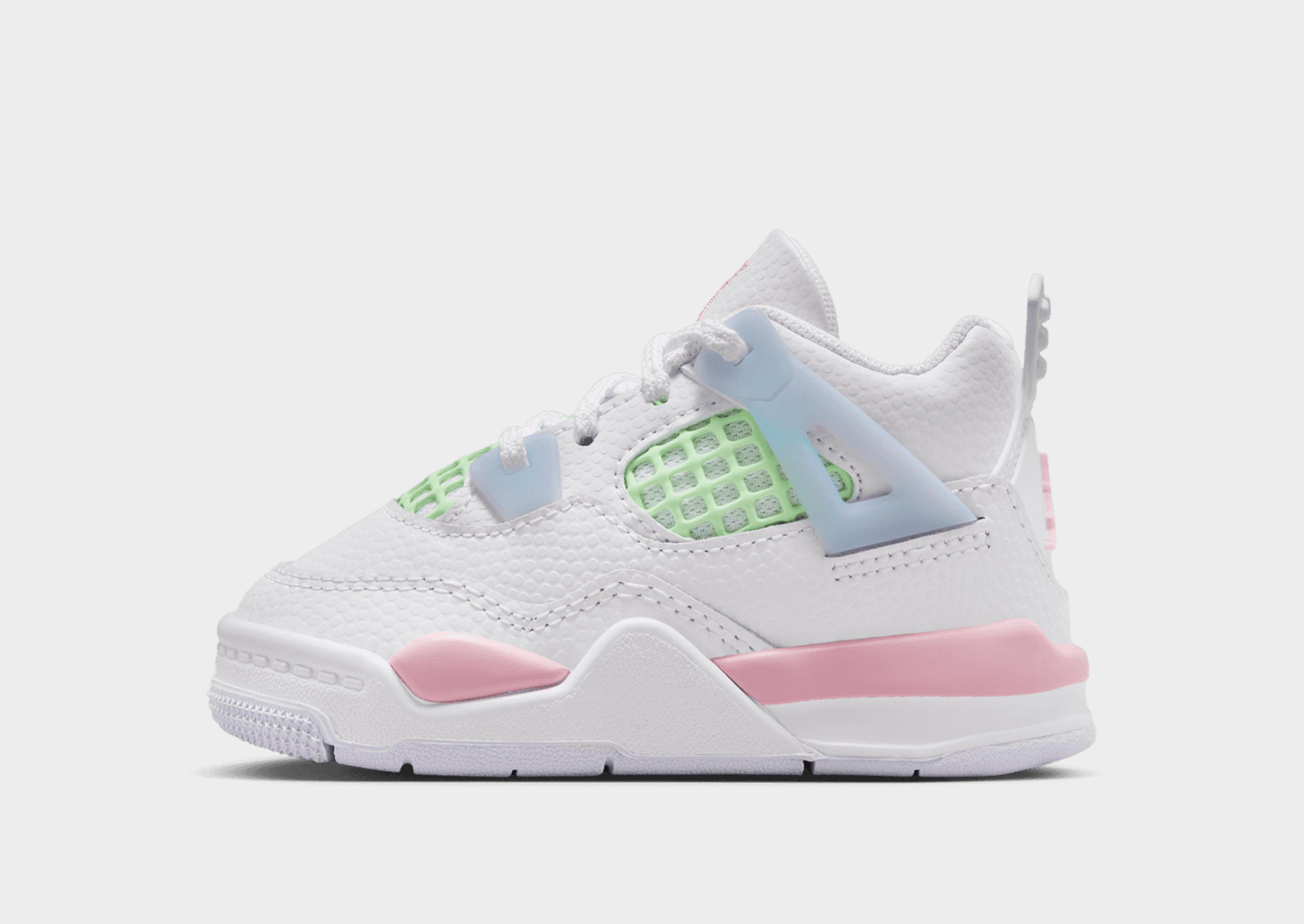 Level up your sneaker rotation with the iconic Air Jordan 4, a symbol of sneaker culture and streetwear fashion. Landing in a White colourway with Pink details, these infant's sneakers have a durable canvas upper for a clean and classic look. They feature a lace fastening with a padded ankle collar for a snug, supportive feel. Underfoot is a soft foam midsole with a visible Air-Sole unit to the heel for cushioned comfort with every step. With a paint-splatter pattern to the rubber outsole for a statement style and traction, they're finished up with Jordan branding to the tongue. Style Code: IB7070-100