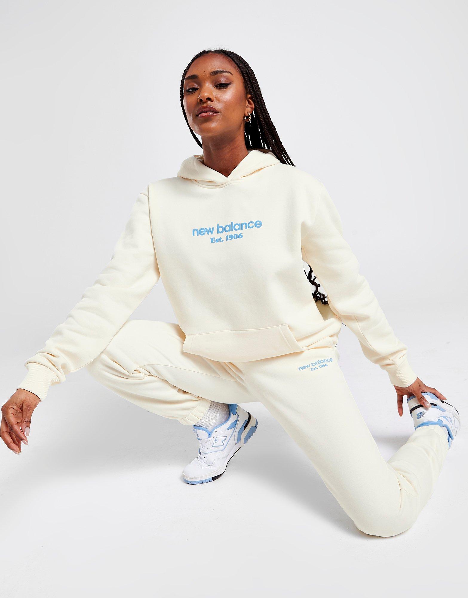 Level up your laidback looks with these women's Small Logo Joggers from New Balance. Exclusive to JD, these standard-fit sweats are made with super-soft cotton-blend fleece in an Off White colourway. They feature an elasticated waistband with a drawcord for a custom fit, with cuffed ankle to secure the shape. They have side pockets for easy storage, and are finished up with New Balance branding to the thigh. Machine washable. | Our model is 5'8" and wears a size small.