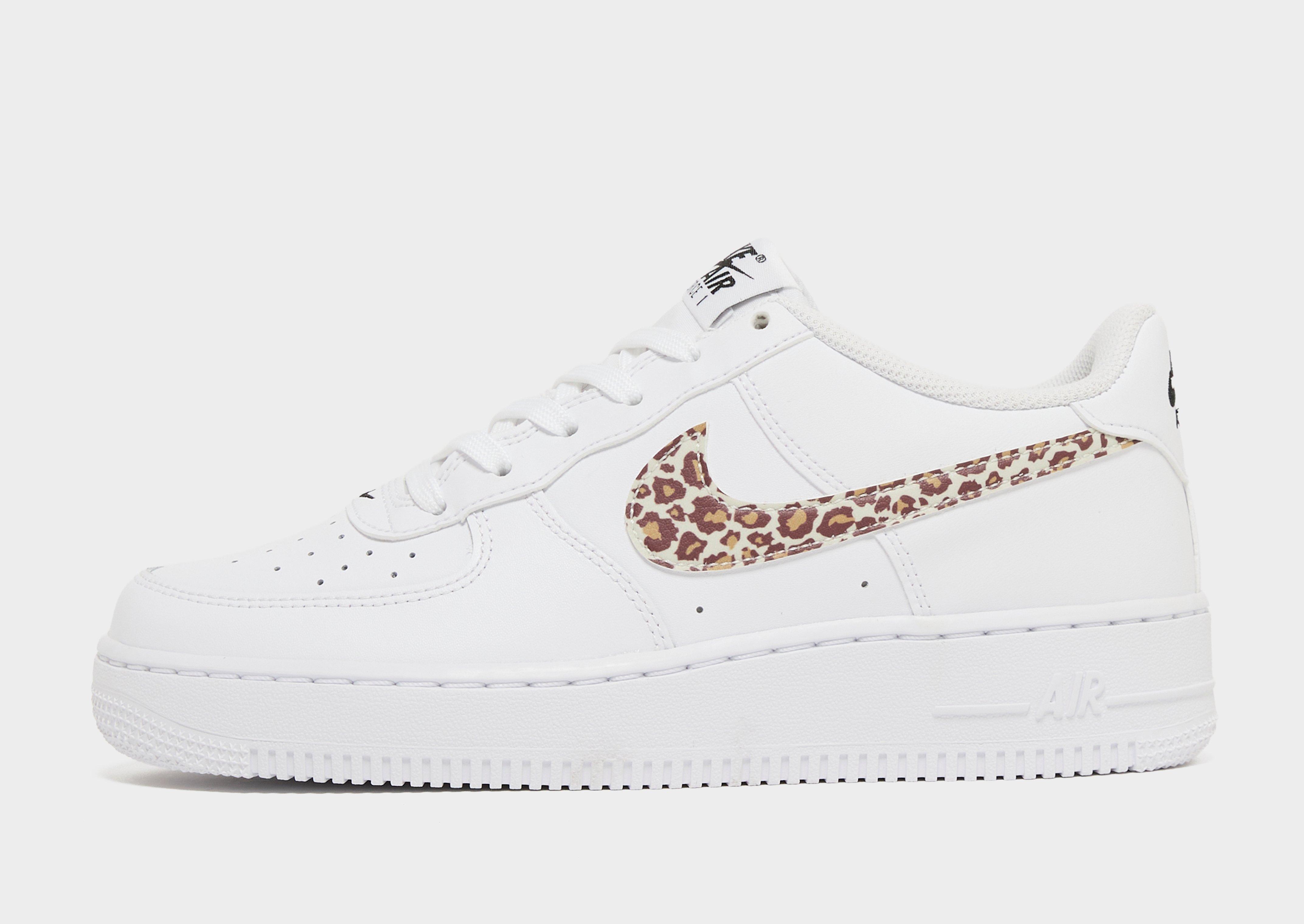 Stand tall in the style stakes with these JD-exclusive junior's Nike Air Force 1 '07 shoes! An instant icon since its 1982 debut, the AF1 was Nike's first basketball sneaker with a full-length Air Sole unit in the midsole. Hugely popular on the hip-hop scene, these Air Force 1 shoes are built with a White leather upper for hard-wearing comfort and sat atop the legendary Air Sole unit for optimum impact protection step after step, with pivot points in the outsole to deliver smooth movements from the courts to the streets. The legendary Swoosh in leopard print finishes things off with authority. Style Code: IR0273-100