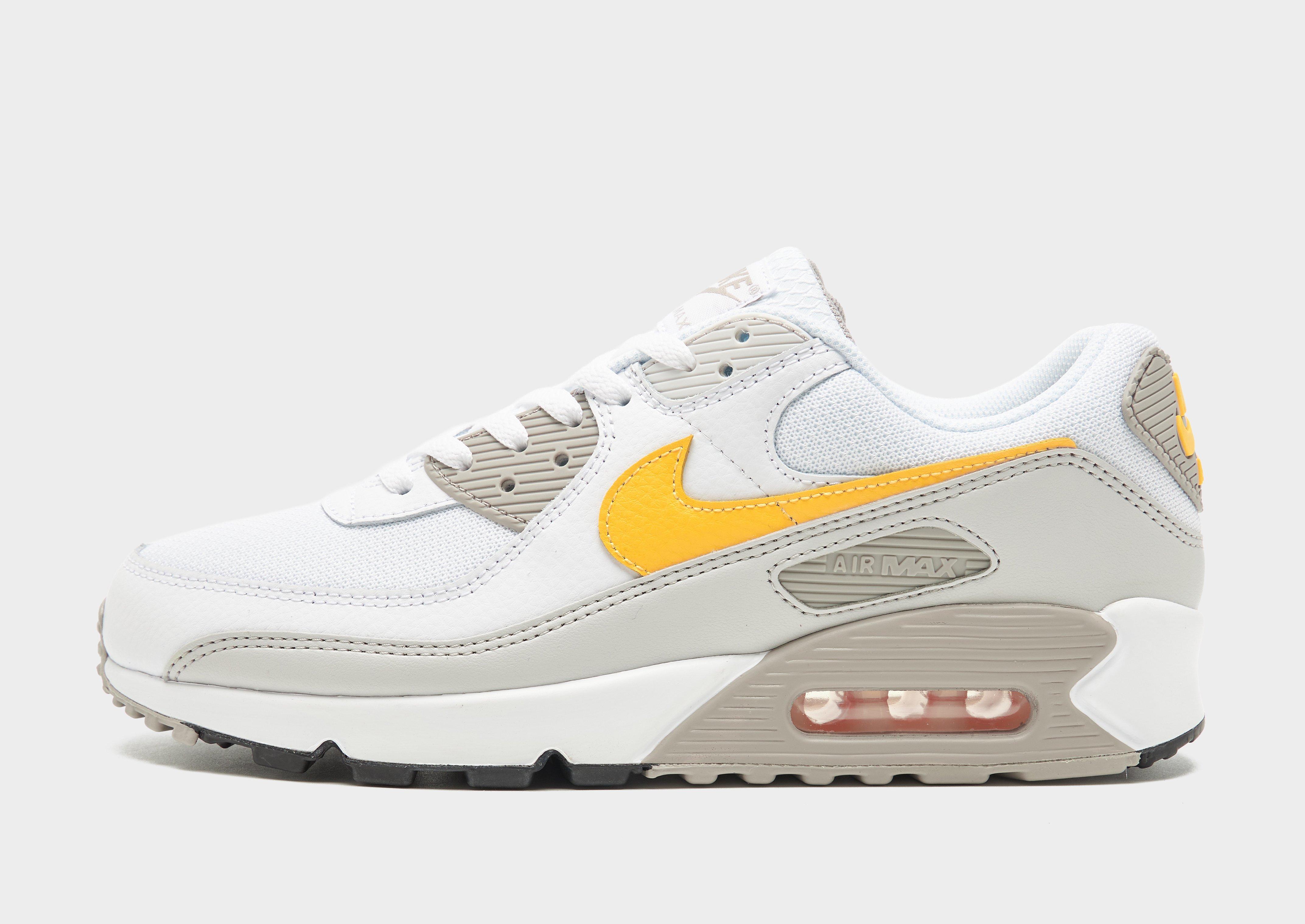 Giving Tinker Hatfield's '90 OG an upgrade, these men's Air Max 90 shoes from Nike are streetwear essentials. In a White colourway with Orange details, these sneakers are built with a premium leather upper for supreme support. Keepin' the same design lines as the classic, a tonal lace-up fastening keeps you locked in and a lightweight midsole with a visible Air unit in the heel brings a smooth ride and essential cushioning. With a grippy rubber tread underfoot, these shoes are finished with Air Max branding and a Swoosh to the sidewalls. Style Code: DM0029-119