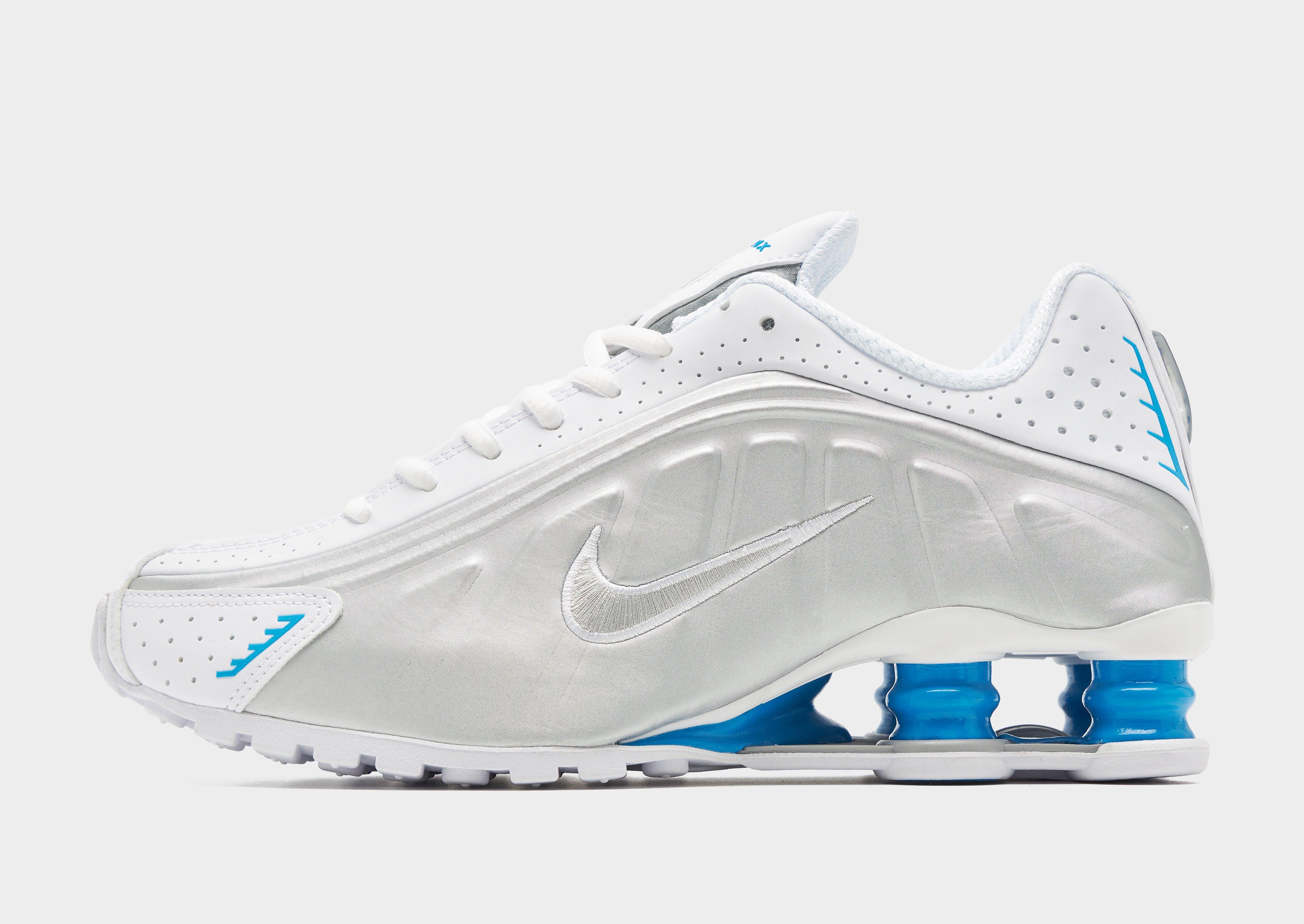 Retro but futuristic, these women's Shox R4 sneakers from Nike bring back the 2003 icon in its OG form. In a White colourway with Silver details, these statement shoes are built with a breathable mesh upper that features glossy TPU overlays and a tonal lace up fastening for a locked-in fit. Nike's iconic Shox tech sits underfoot, with a full-length midsole of springy Shox columns for a super comfy feel. With a grippy rubber sole, these trainers are finished with Shox branding to the tongue and the signature Swoosh logo embroidered to the sidewalls. Style Code: AR3565-105