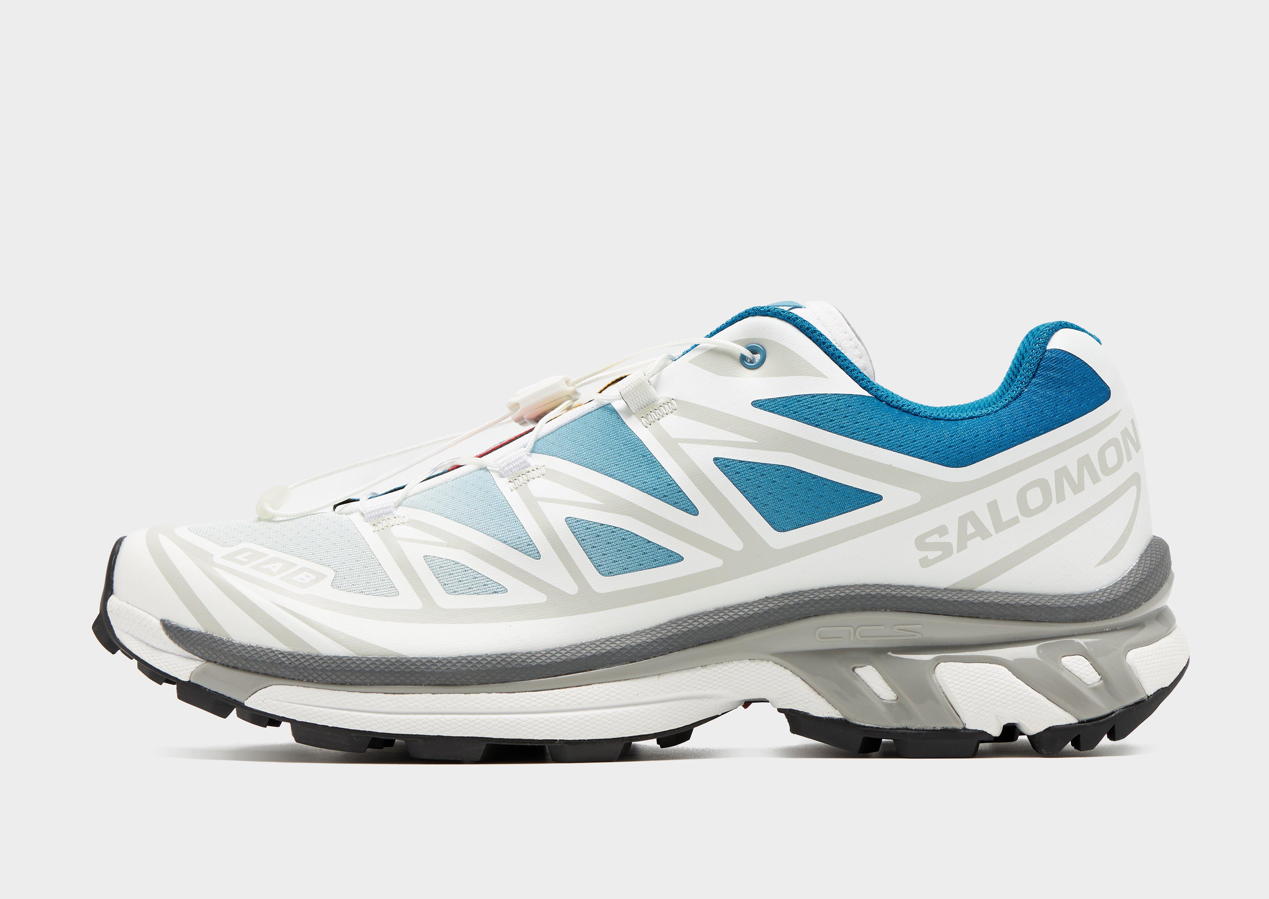 Take on any terrain with these men's Salomon XT-6 trainers, designed for high-performance trail running and outdoor exploration. Built for durability and stability, they deliver confidence on both urban streets and rugged paths. The lightweight upper supports breathability, while the aggressive outsole grips varied surfaces. Finished in a white and faded blue colourway, they combine technical performance with standout outdoor style.